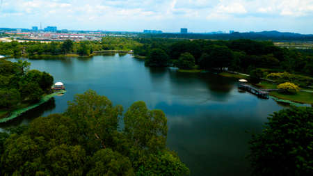 An urban lake in a public park in Malaysia taken by a drone surrounded by trees and greenery