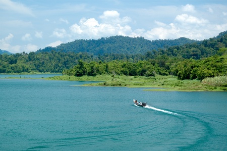 YALA, THAILAND - DEC 3, 2018 : Tourists take a boat to see the scenery of the forest, wildlife and Bang Lang reservoir on December 3, 2018. Bang Lang reservoir is in area of Hala-Bala Wildlife Sanctuary. There are various animals live around here.