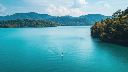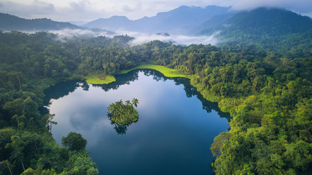 This stunning aerial view showcases lush green islands amidst a tranquil blue lake, framed by majestic mountains under a bright sky, perfect for nature lovers.