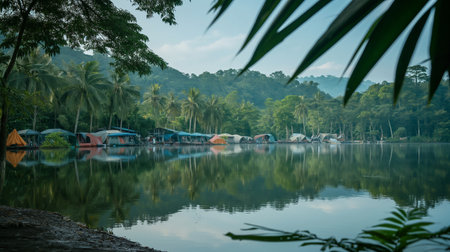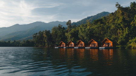 A peaceful lake scene featuring cozy floating cabins nestled among tranquil mountains, perfect for a relaxing getaway in nature's embrace at dusk.