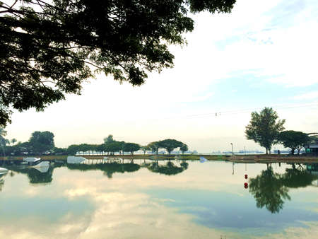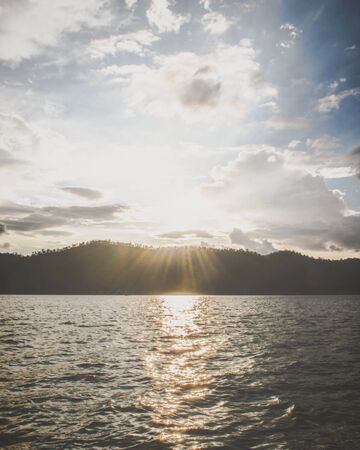 Beautiful landscape morning with rising sun on lake at Hat Som Paen, Mueang Ranong District, Ranong Province, Thailand