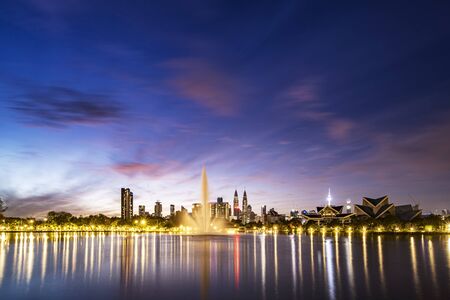 Cityscape that reflected on the pool near Petronas twin towers park's pool in Kuala Lumpur, Malaysia.