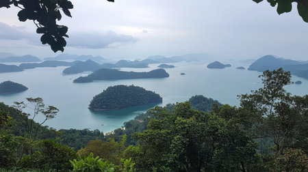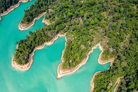 Aerial view looking downwards onto tiny islands and fingers of tropical rainforest covered land in a huge lake