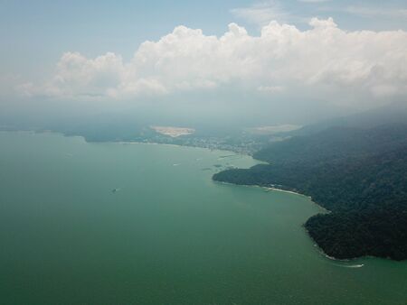Teluk Bahang, Penang/Malaysia - Mar 08 2020: Aerial view Batu Feringghi condominium and sea.