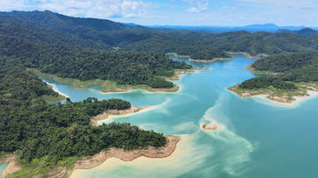Aerial view of jungle-covered islands on a huge lake surrounded by limestone cliffs. (Cheow Lan Lake, Khao Sok, Thailand)