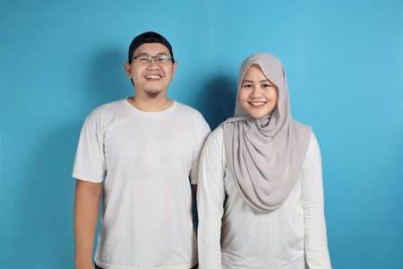 Portrait of happy Asian muslim couple wearing traditional clothes and smiling