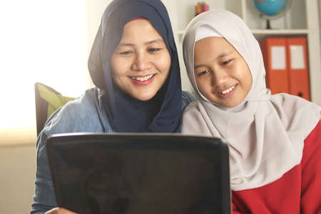 Asian muslim mother and daughter smiling when using laptop together, browsing internet or watching streaming movie, happy casual lifestyle