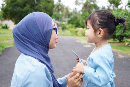 A Malay Girl in Malay traditional cloth showing his happy reaction hug her mother after received money pocket during Hari Raya celebration. Selamat Hari Raya or Happy New Year. -