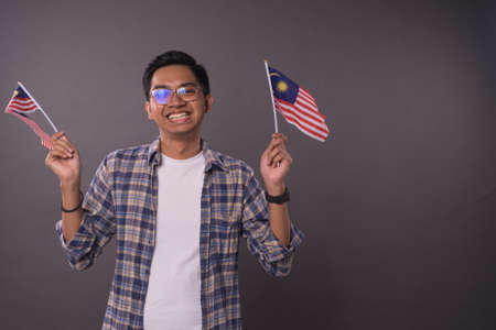 Happy Malaysian teenager holding Malaysia Flag.Independence day and patriotic concept.Studio Shot.