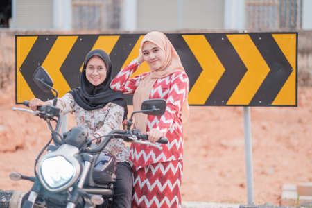 Muadzam Shah, Malaysia- April 10th, 2019 : Beautiful young Asian girls with hijab standing on the side of a motorcycle with a smile