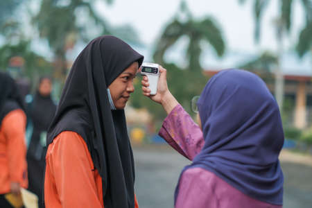 Muadzam Shah, Malaysia- July 9th, 2020: Teacher using thermometer temperature screening student for fever against the spread of COVID-19 while student coming back to school, Education concept.