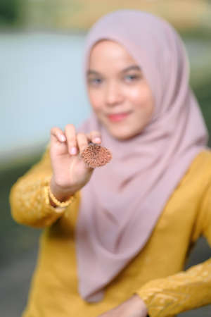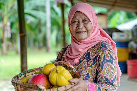 Malay Muslim woman smiling, holding basket made of weaving bamboo full of local fruits.
