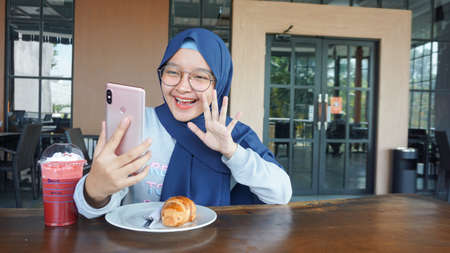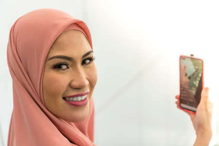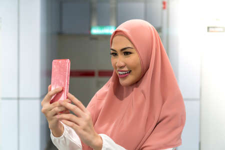 Asian Muslim Lady at the train station wearing hijab taking selfie and smile