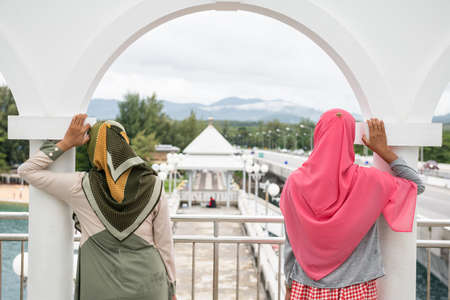 Rear of 2 young muslim female friends enjoy view from Sarasin bridge, Thailand. Famous travel destination boundary btw Phuket and Phang Nga