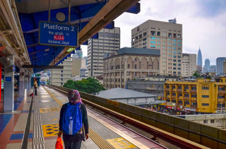 KUALA LUMPUR - MAY 10: Passengers wait on a train station platform of the RapidKL LRT rail network on May 10, 2014 in Kuala Lumpur, Malaysia. RapidKL transports approximately 690,000 people daily.
