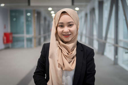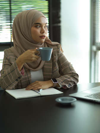 Portrait of young muslim businesswoman take a coffee break while sitting at workplace