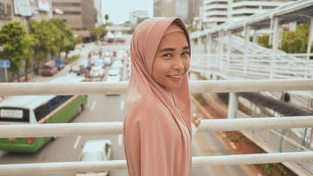 A smiling Muslim girl is walking on the transition over road traffic. Indonesia.