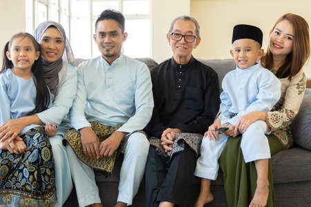 Eid Mubarak celebration moment, family wearing traditional cloth smiling at the sofa