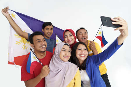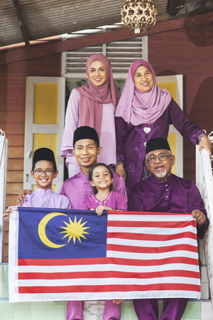Happy multi racial Malaysian people holding Malaysia Flag.Independence day and patriotic concept.Studio shot.