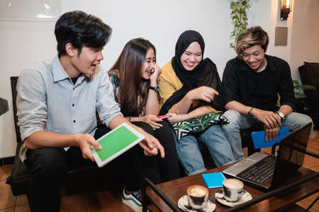 Group of young Muslim asian teenagers sitting at cafe talking each other