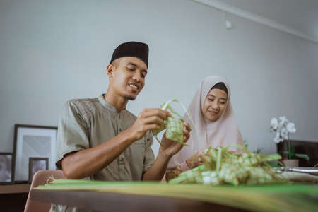 muslim couple asian making ketupat rice cake at home using palm leaf