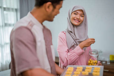 Eid Mubarak celebration moment, malay husband and wife at the dining table. Happy asian family
