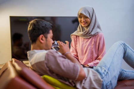 muslim wife waking her husband up in the bed to have a breakfast for fasting during day of ramadan month