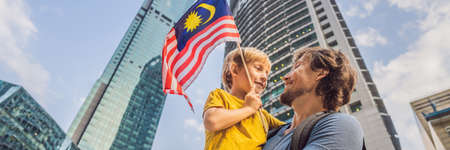 Dad and son tourists in Malaysia with the flag of Malaysia near the skyscrapers. Traveling with kids concept BANNER, LONG FORMAT