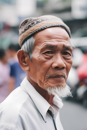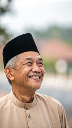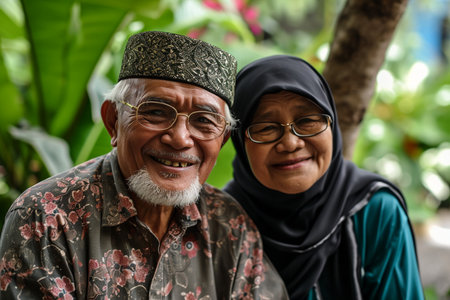 a touching portrait of a happy elderly Muslim couple, demonstrating warmth and love carried through the long years of marriage, concept of a long and happy family life, family values and traditions,