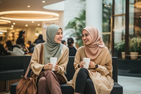 Hijab women drinking coffee and talking in the lobby of shopping mall, Female Muslim friends having coffee together in a shopping mall, AI Generated