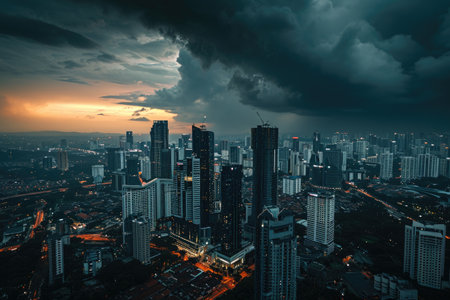 A view of a city with towering buildings reaching into the sky against a backdrop of clouds, An aerial view of a city's skyline against a stormy sky, AI Generated