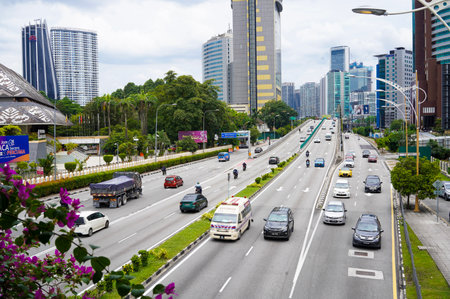 Kuala Lumpur, Malaysia - October 17, 2024 - Eight-lane highway in Kuala Lumpur with traffic and high-rise buildings.