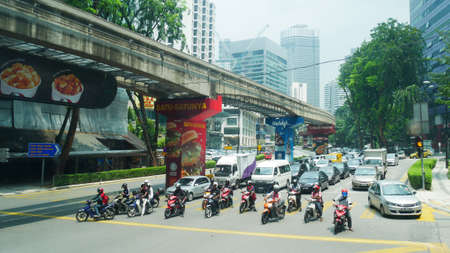 Kuala Lumpur, Malaysia- March 2018: Traffic at a main street in Kuala Lumpur with motorcycles in the front.