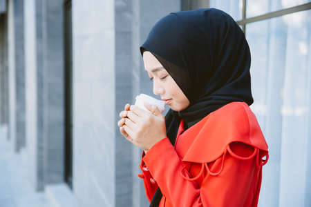 Arab Muslim women drinking coffee in the morning outdoor, Asian businesswoman young girl smiling hand hold coffee cup standing closeup.
