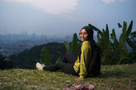 Pretty girl sitting on grass, relaxing, enjoying Kuala Lumpur city view during sunset. Portrait of young Asian woman, wearing hijab and green attire.