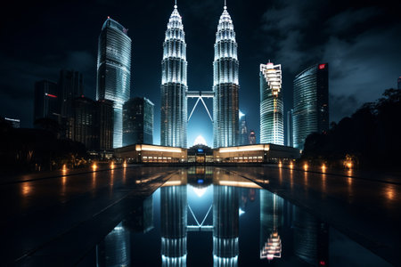 Petronas Twin Towers illuminated at night. Kuala Lumpur City Centre Park