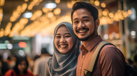 Portrait of happy Asian muslim couple looking at camera in shopping mall