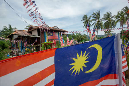 Georgetown, Penang/Malaysia - Aug 29 2020: Malays kampung house with hanging of Malaysia flag.