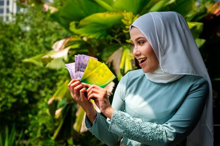 A portrait of young malay woman with surprise happy expression, holding an envelope of pocket money or raya angpao of Malaysian Currency. Translation on the envelope : Happy Eid Mubarak. Raya Concept.