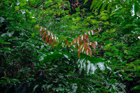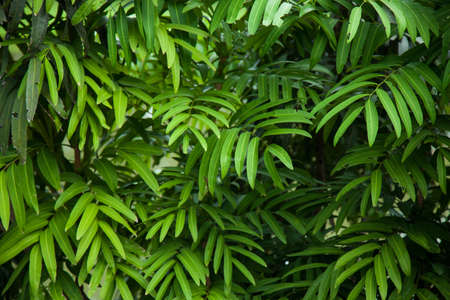 Green leaf texture background, tropical leave foliage are shaped like tiny spikes, leaves in tropical forest, green concept.
