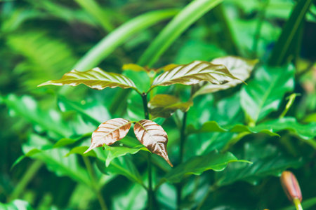 greentropical leaves in the forest spring nature background dark filter effect