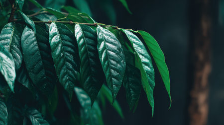 A detailed close up shot of vibrant green leaves on a branch. The dark, atmospheric background highlights the natural texture and rich color of the foliage.