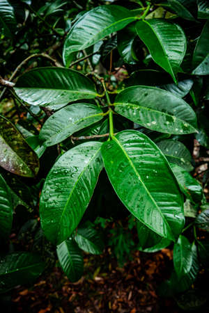 Green leaves with water drops in tropical forest, Thailand. Nature background