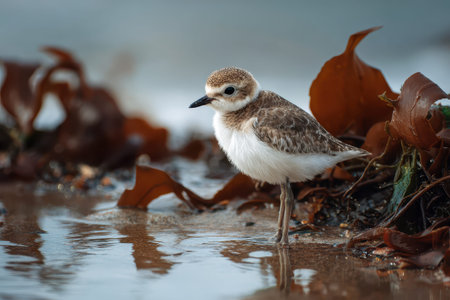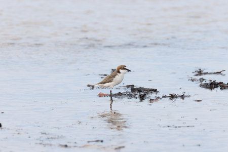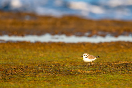 Young Kentish Plover observed along the shoreline surrounded by seaweed at the beach during a calm day near the ocean