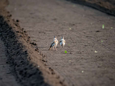 A pair of Japanese skylarks, Alauda arvensis japonica, hop along a freshly ploughed field in Yokohama, Japan.
