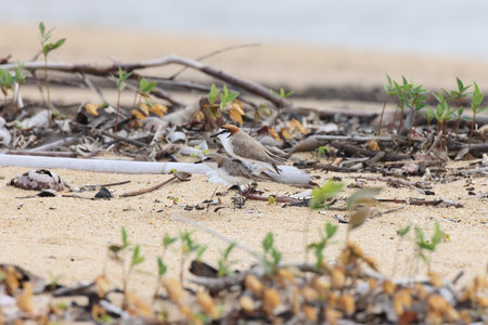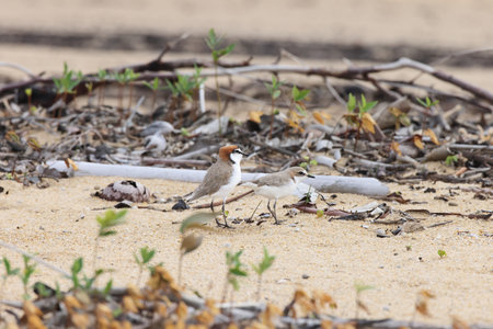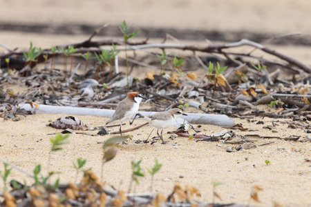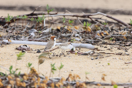 Couple of Malaysian plover is a small wader that nests on beaches and salt flats in Southeast Asia. The male can be recognized by a thin black band around the neck; the female has a thin brown band. Its legs are pale. Its voice is a soft twit.
