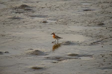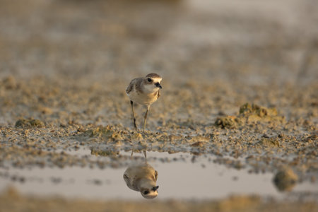 Lesser sand plover on wetland with perfect reflection in water, Arad, Bahrain