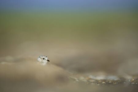 A young Piping Plover chick peeks its tiny head out from behind a small hill of sand.