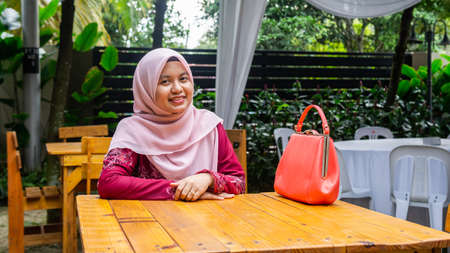 A portrait of beautiful young Muslim Malay woman wearing a hijab and modern traditional dress called Baju Kurung with a pink handbag on a wooden table at wedding event.