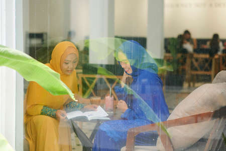 Muslim female students sitting at cafe table and reading book together